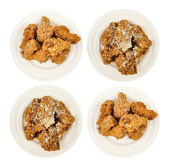 32 wings with four medium milk or fruit teas (upgrade to large or soda available). Choose up to two flavors—16 wings per flavor. Note: Soda is one size, topping-free, kid-friendly, and caffeine-free.